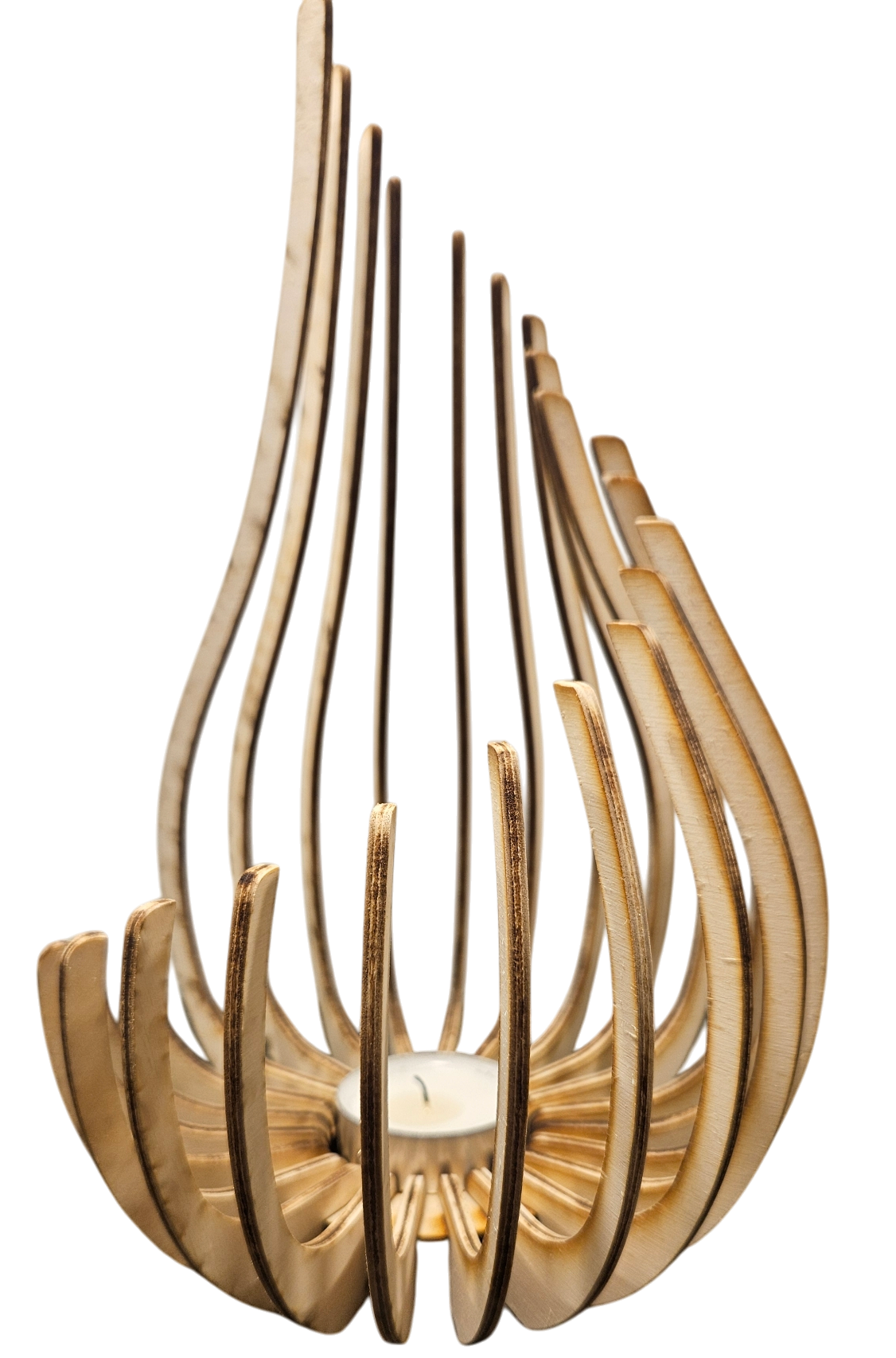 Das Holz Design Windlicht – Tropfen bringt organische Eleganz in Ihr Zuhause. Inspiriert von der Form einer fallenden Wassertropfenflamme, wirkt dieses Windlicht sowohl weich als auch kraftvoll. Die geschwungene Silhouette mit fliessenden Linien verleiht jedem Raum eine natürliche Leichtigkeit – ob als Blickfang im Wohnzimmer oder als sanftes Lichtobjekt auf der Terrasse.