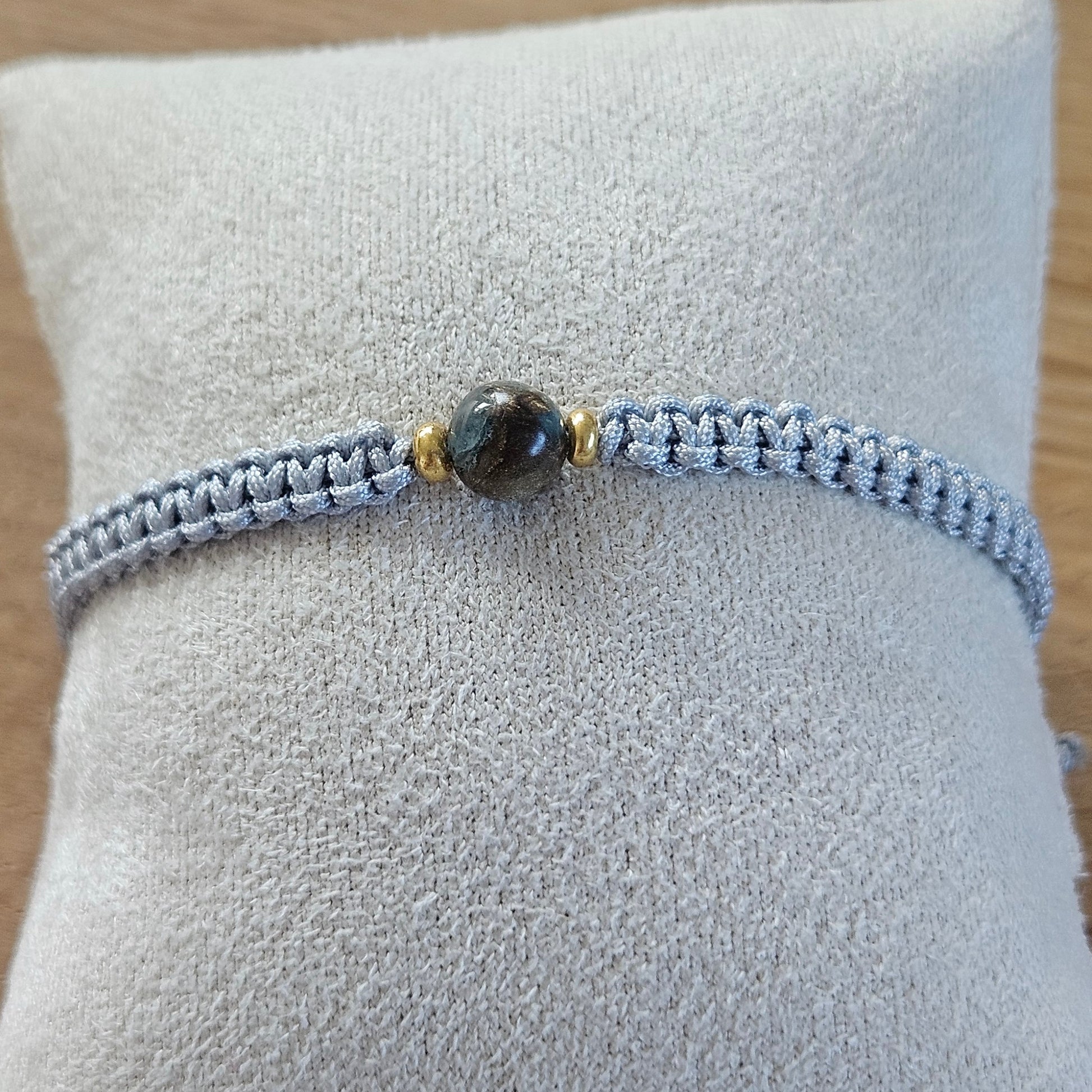 Das handgeknüpftes Makramee Armband „Line“ zeichnet sich durch sein klares, gerades Knüpfmuster und einen eingearbeiteten Naturstein, der dem Schmuckstück eine besondere Bedeutung verleiht aus.