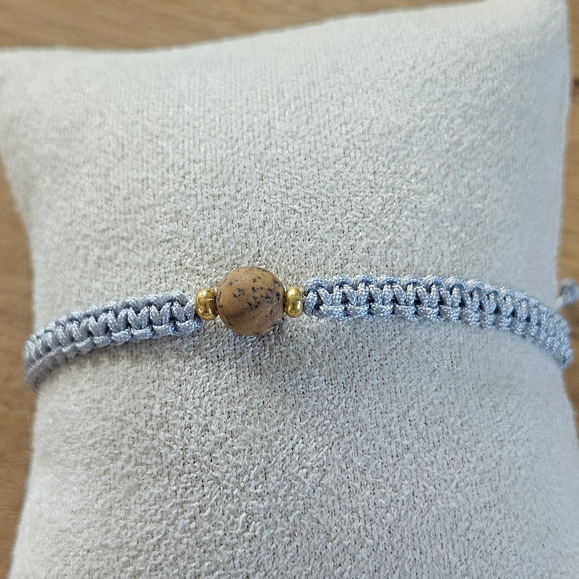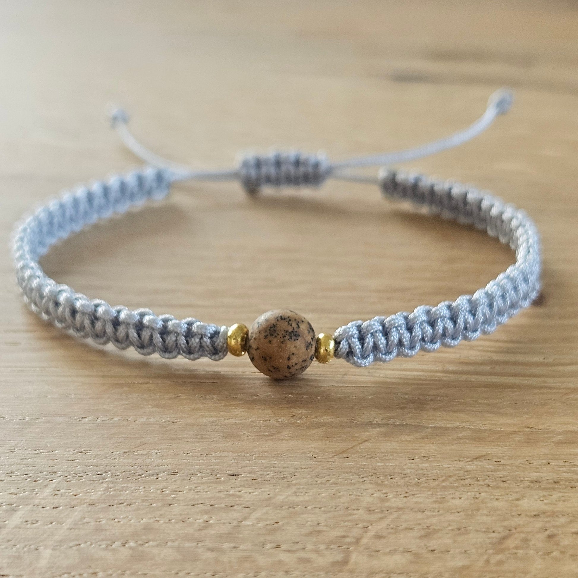 Handgeknüpftes Makramee Armband „Line - Dalmatiner Jaspis“ – Mit echtem braunem Dalmatiner Jaspis-Stein