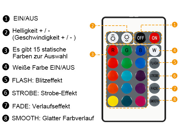 - Beleuchtung: LED-Band mit Fernbedienung (verschiedene Modi & Helligkeit)